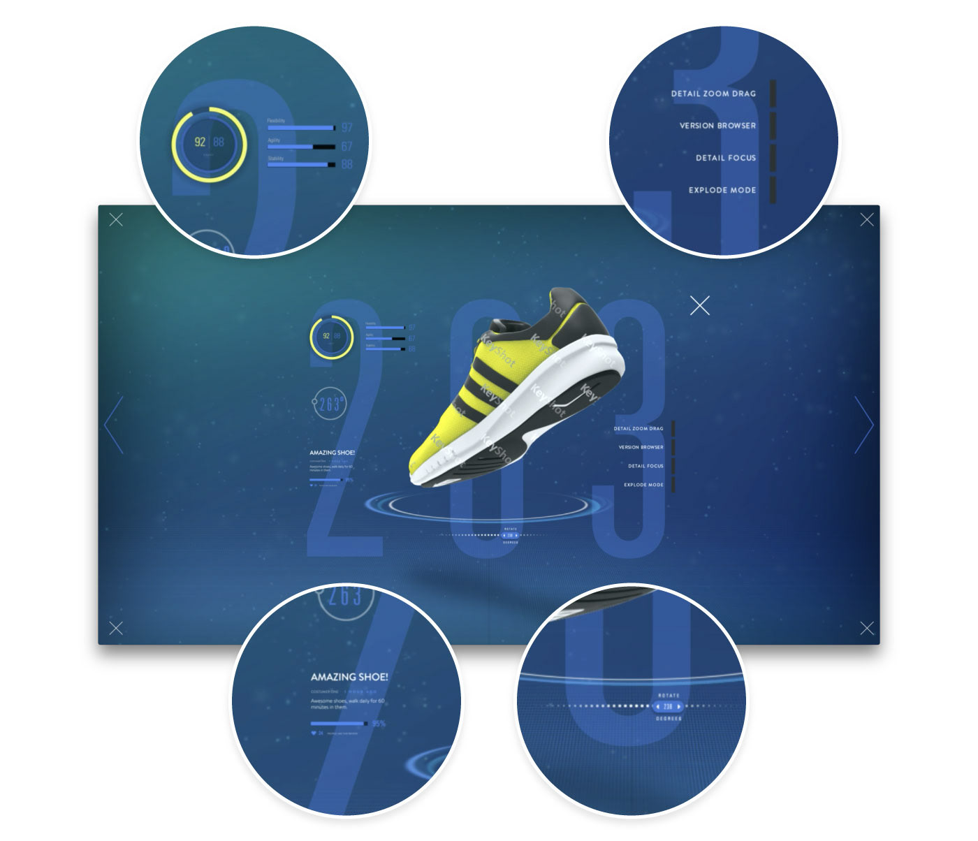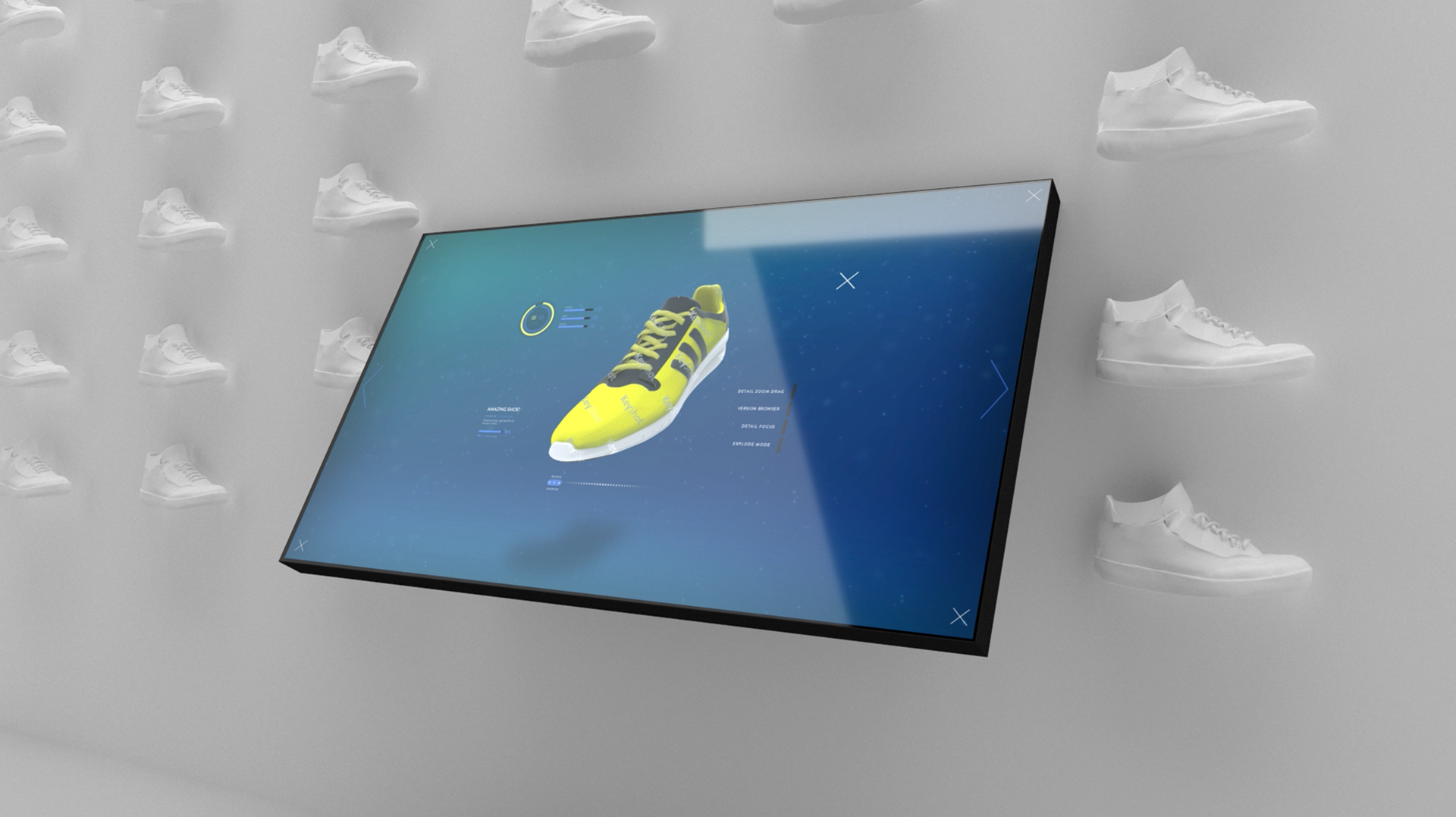 Initial proposal for an interactive experience for a sneaker display wall where users could browse through the features of each shoe with a large touchscreen.